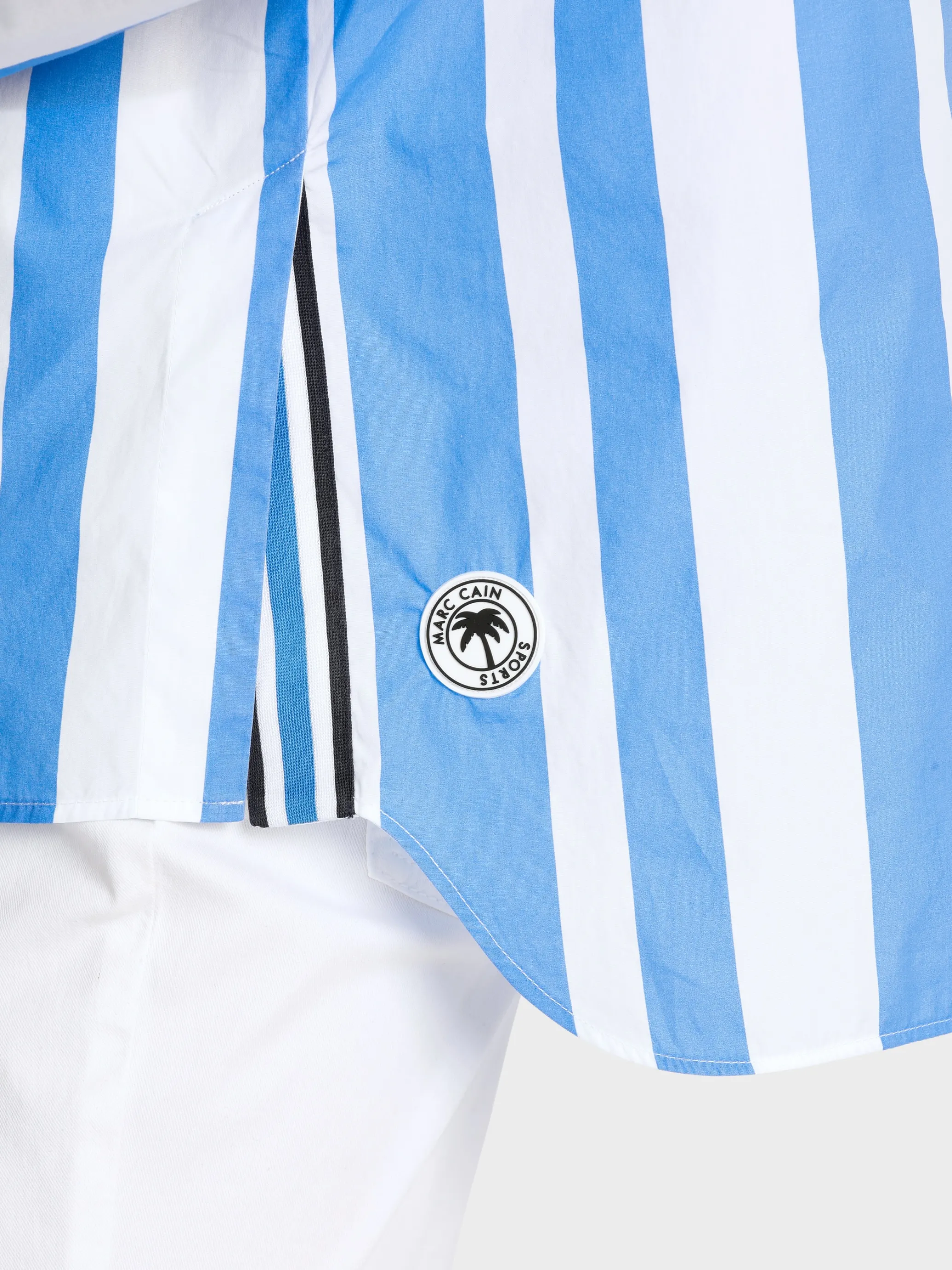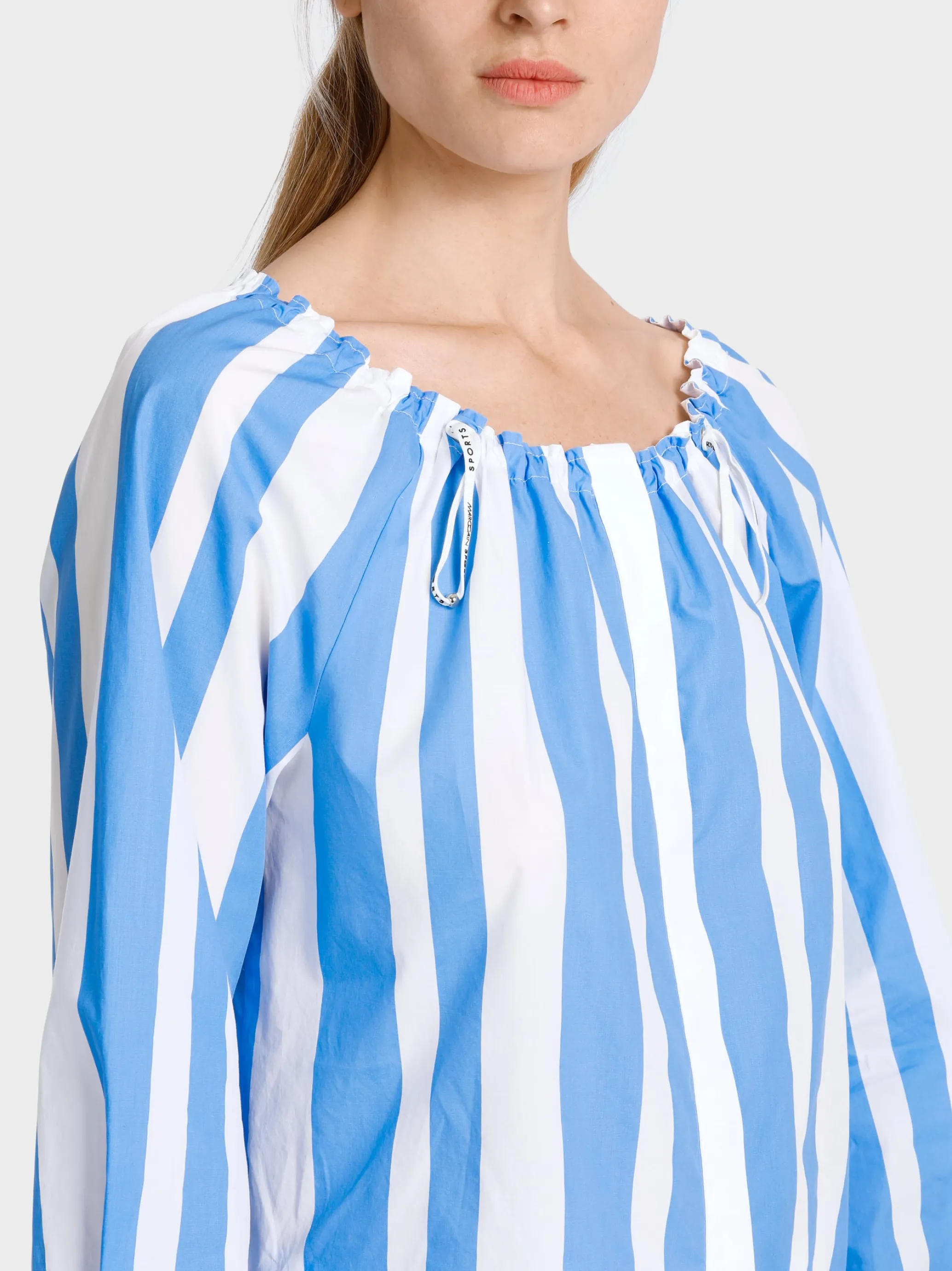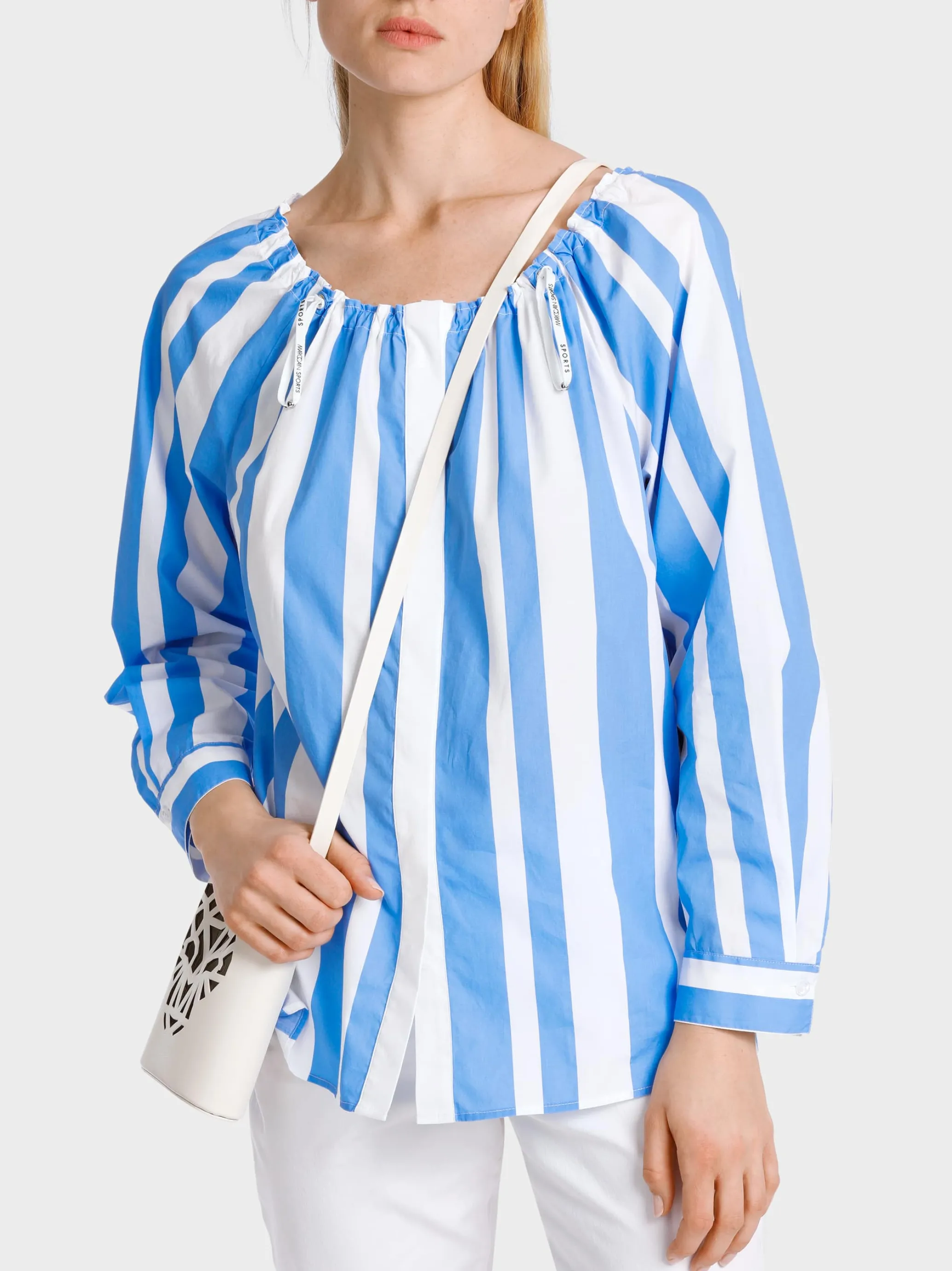 Carmenbluse "Rethink Together" – Diese Carmenbluse besticht mit ihrem sommerlichen Look. Der weite Ausschnitt lässt sich durch das Marc Cain Zugstoppbändchen verstellen. Das Streifendessin sorgt für m